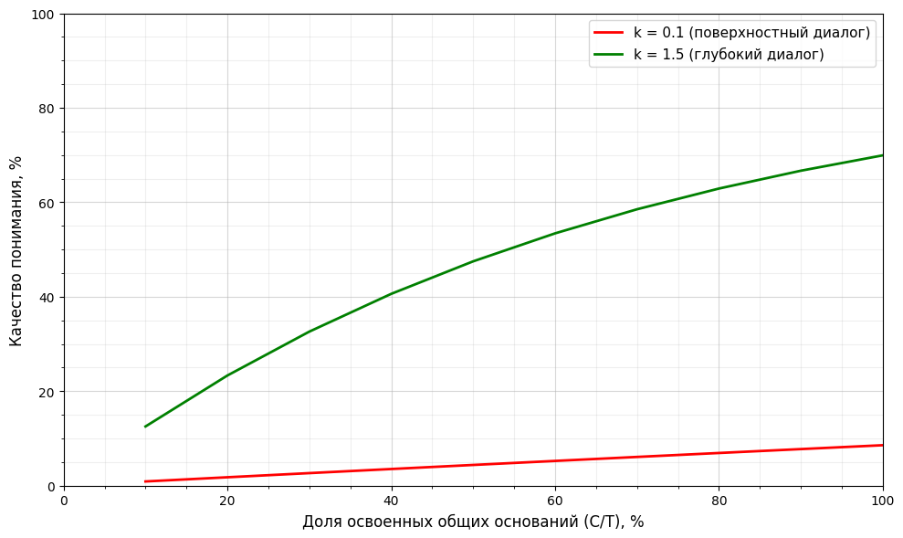 - Верхняя линия (k = 1.5) — продуктивный диалог: каждое новое согласие повышает качество понимания. Умение задавать вопросы и исследовать различия позволяет строить более полную и глубокую истину.