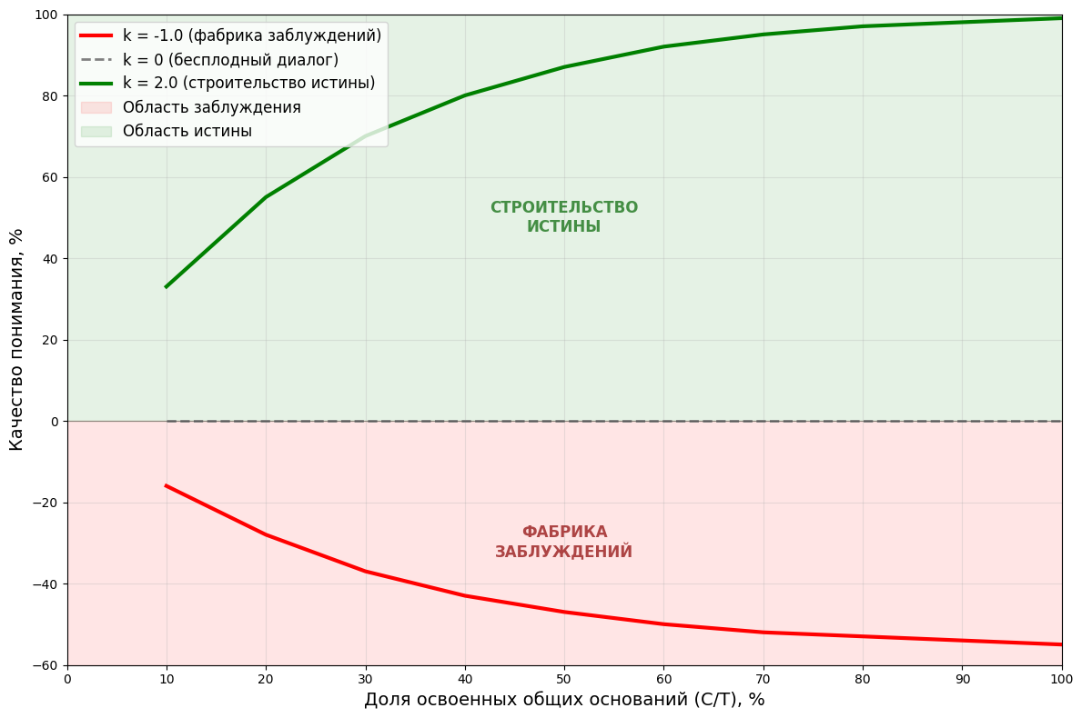 Таким образом, заблуждение — это процесс вытеснения истины. Отрицательный диалог (k < 0) опасен именно тем, что он не просто не продвигает к истине, а активно уводит от неё, создавая ложные конструкции, которые крайне трудно разобрать.